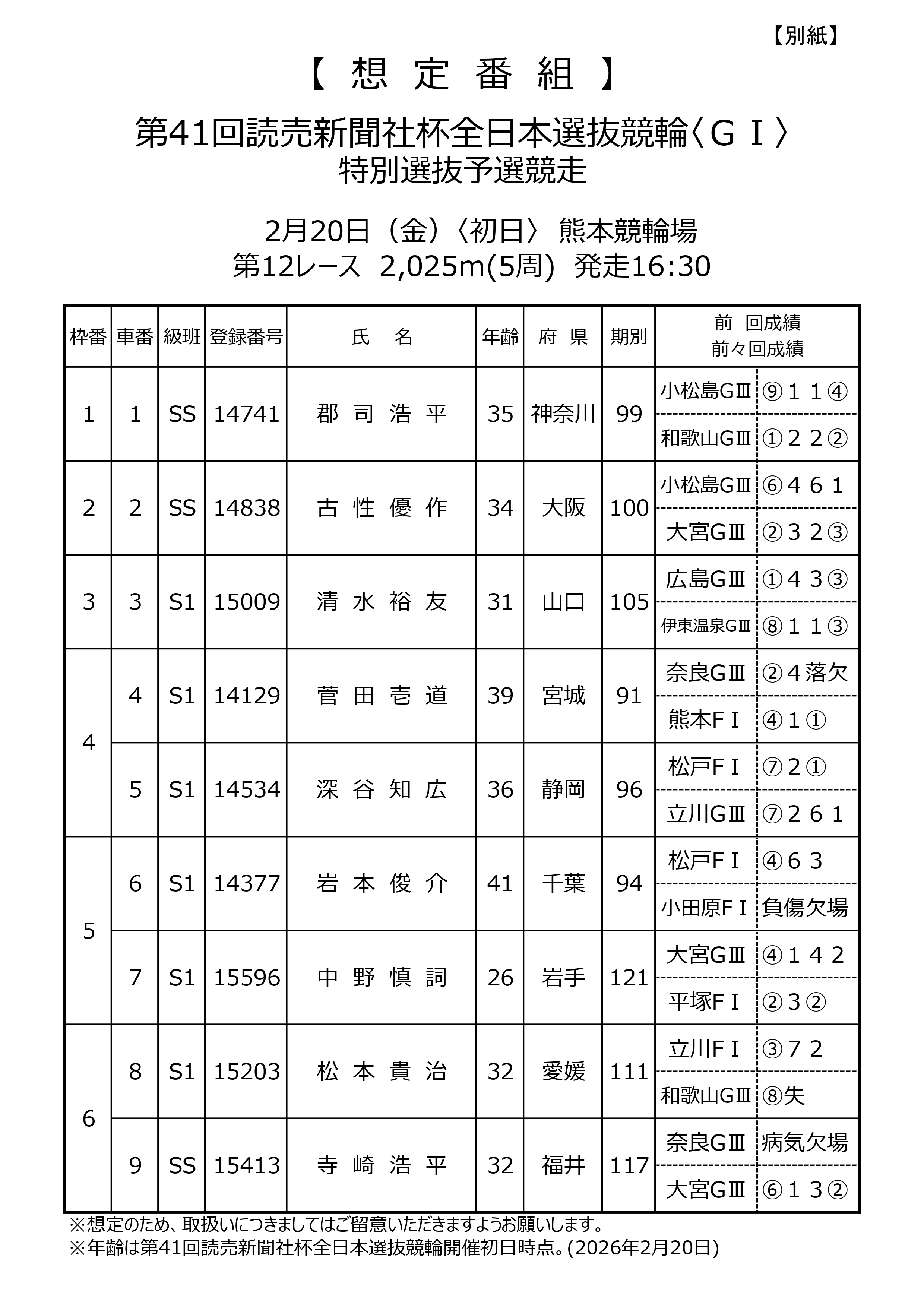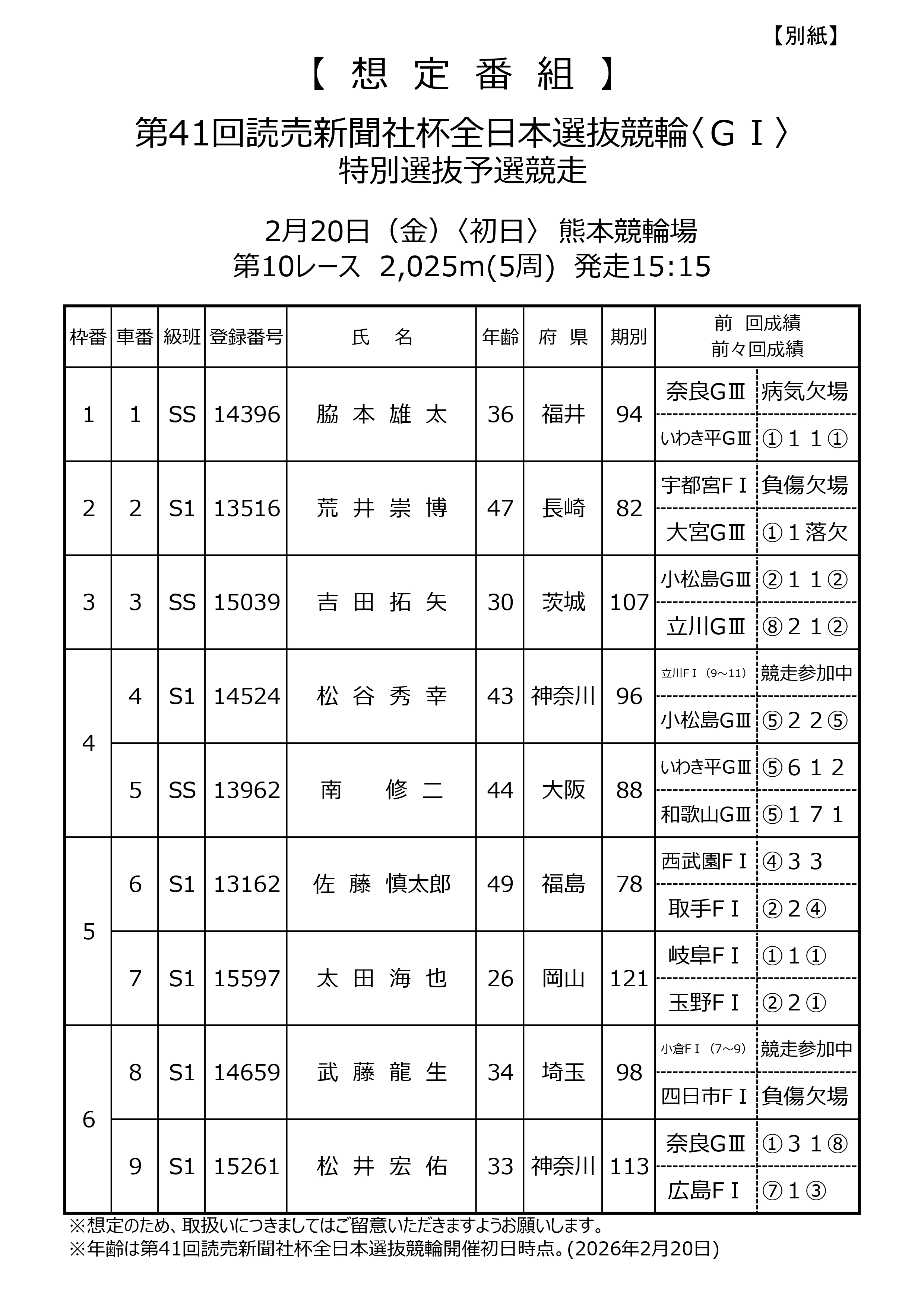 2月20日(金)から2月23日(月・祝)までの4日間、熊本競輪場において開催される「第41回読売新聞社杯全日本選抜競輪」の「特別選抜予選競走」(初日・第10・11・12レース)の想定番組が、別紙のとおりとなりましたので、お知らせいたします。