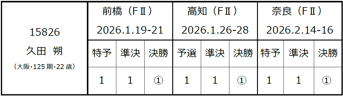 久田 朔(ひさだ はじめ)選手〔大阪・125期〕が2026年2月14日から開催されておりました、奈良競輪(FⅡ・ミッドナイト)の開催において3日間連続1着となり、3場所連続完全優勝を達成し、本日(2月17日)付で『S級2班』へ特別昇級いたしますので、お知らせいたします。
