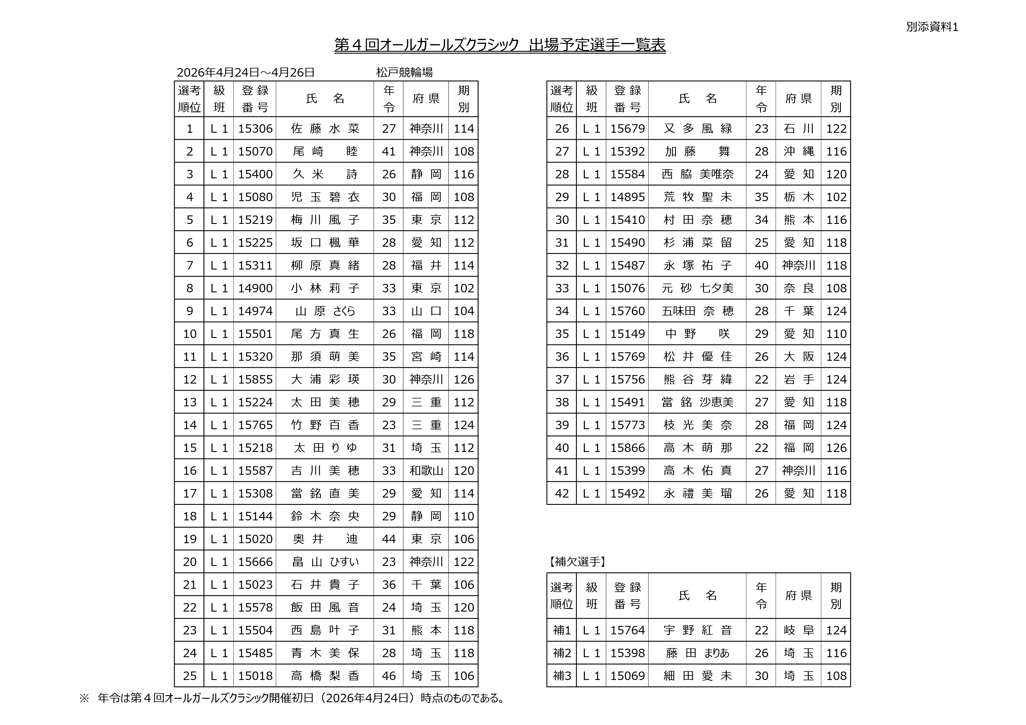2026年4月24日(金)から26日(日)までの3日間、松戸競輪場において開催される『第4回オールガールズクラシック』の出場予定選手が決定しましたので、お知らせいたします。