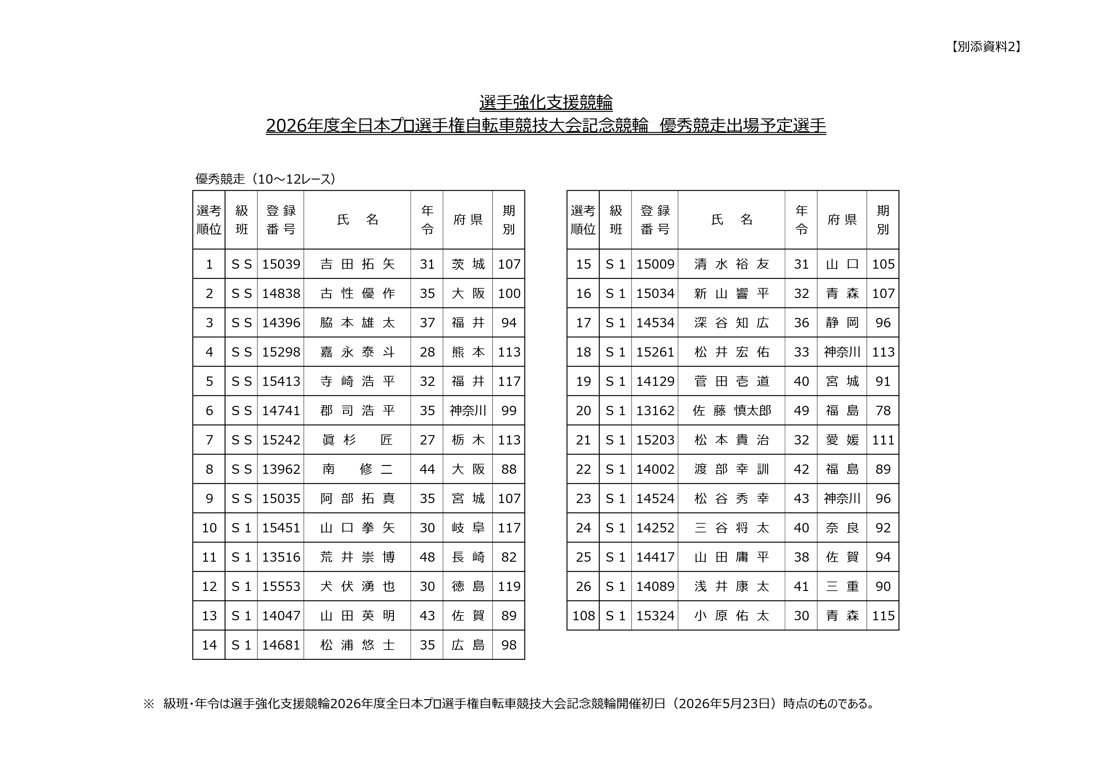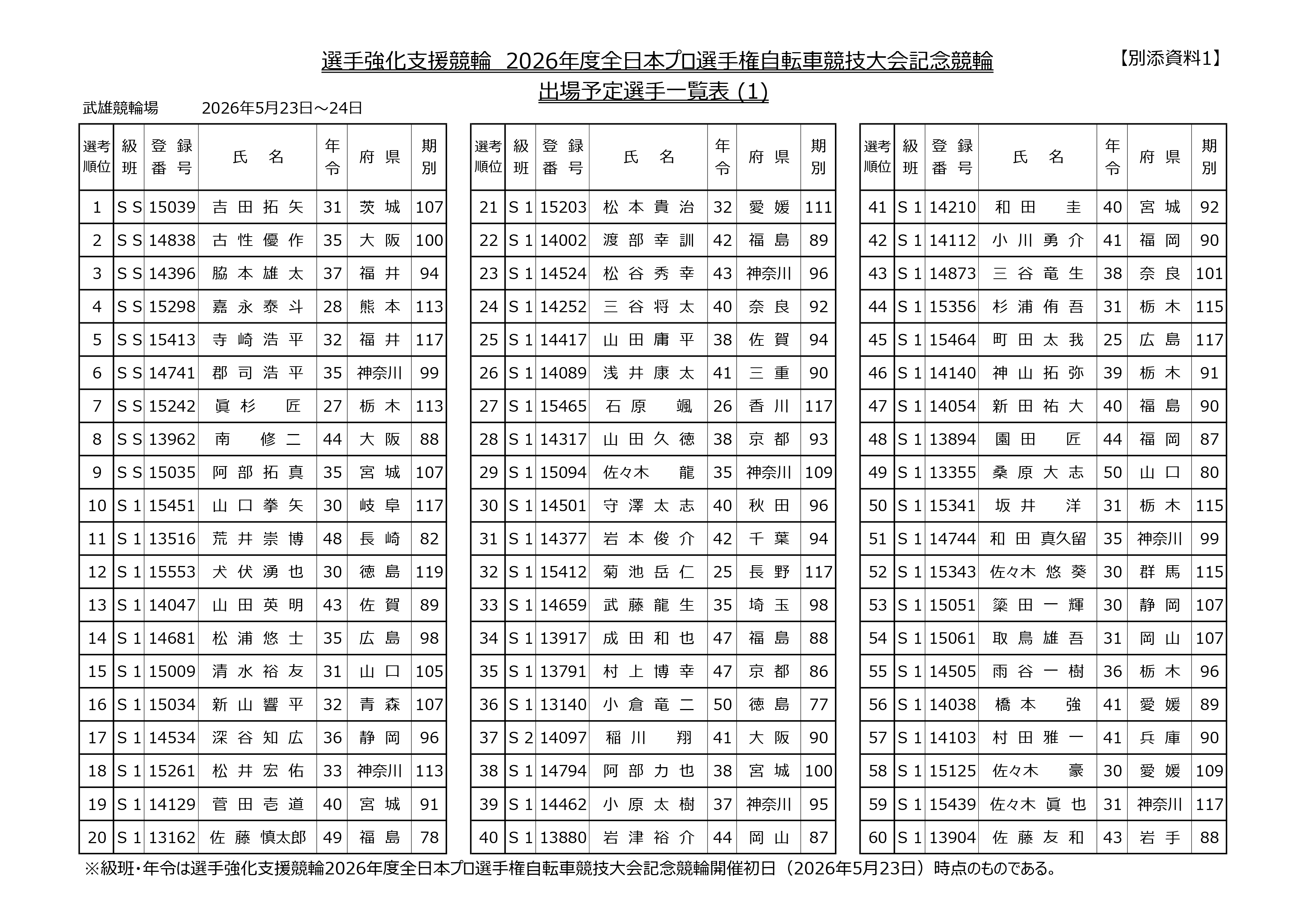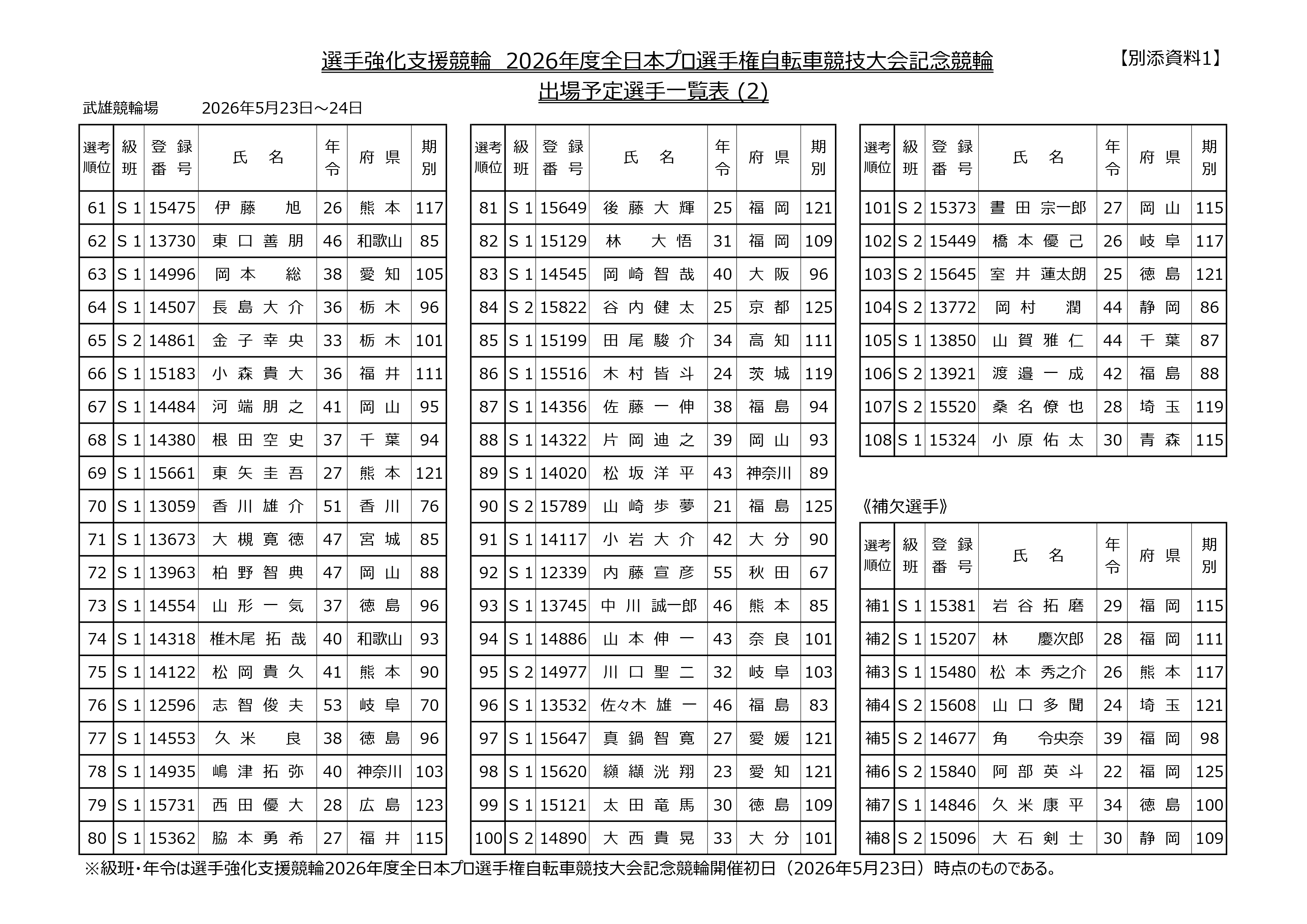 2026年5月23日(土)から24日(日)までの2日間、武雄競輪場において開催される『選手強化支援競輪2026年度全日本プロ選手権自転車競技大会記念競輪』の出場予定選手が決定しましたので、お知らせいたします。