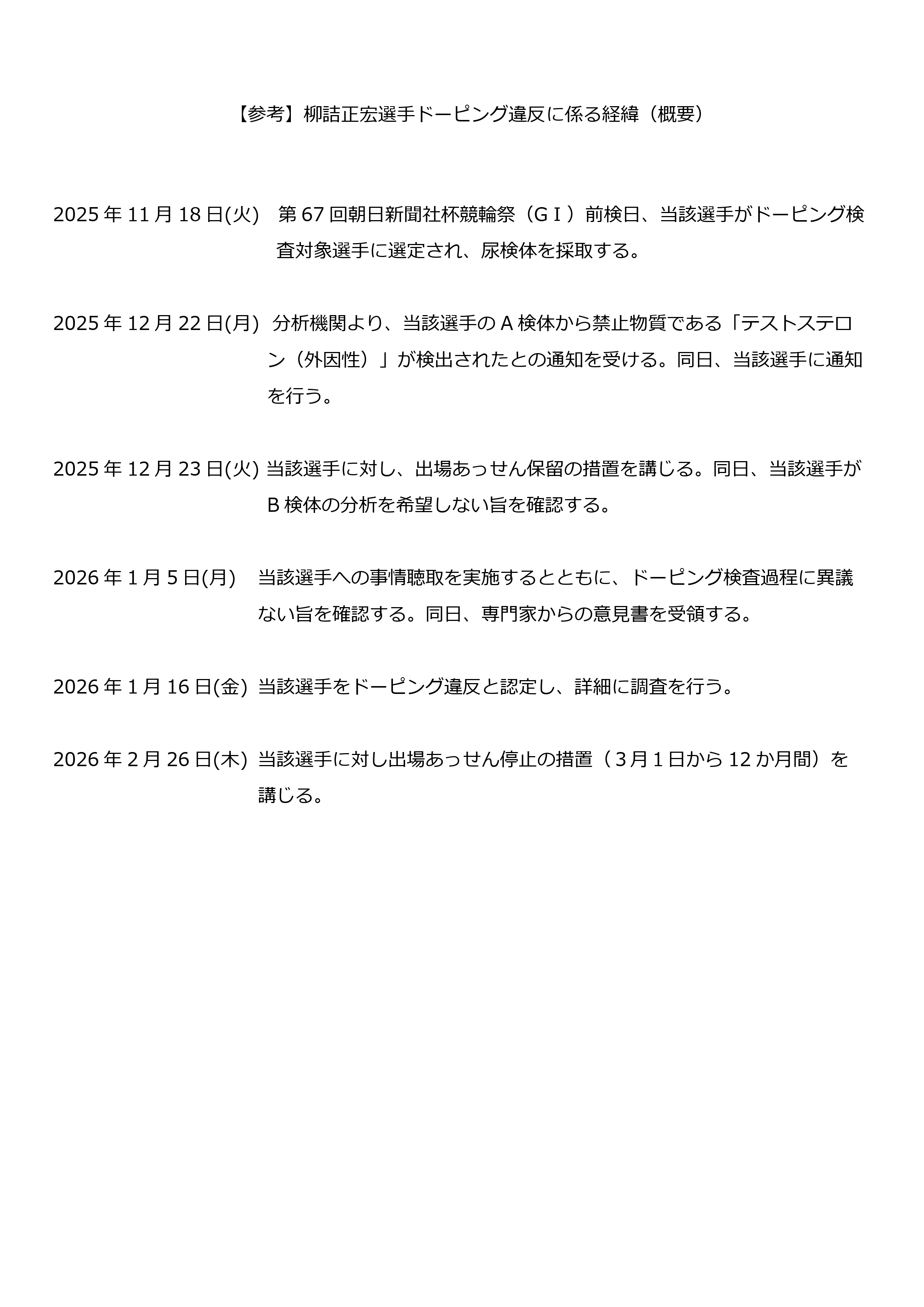 これを受けて、12月23日、当該選手に対し出場あっせんを保留する措置を講じるとともに、当該選手への事情聴取など調査を行った結果、当該選手について、ドーピング検査において禁止物質が検出された事実によるドーピング違反と認定し、出場あっせん停止(2026年3月1日から12か月間)が決定したことをお知らせいたします。