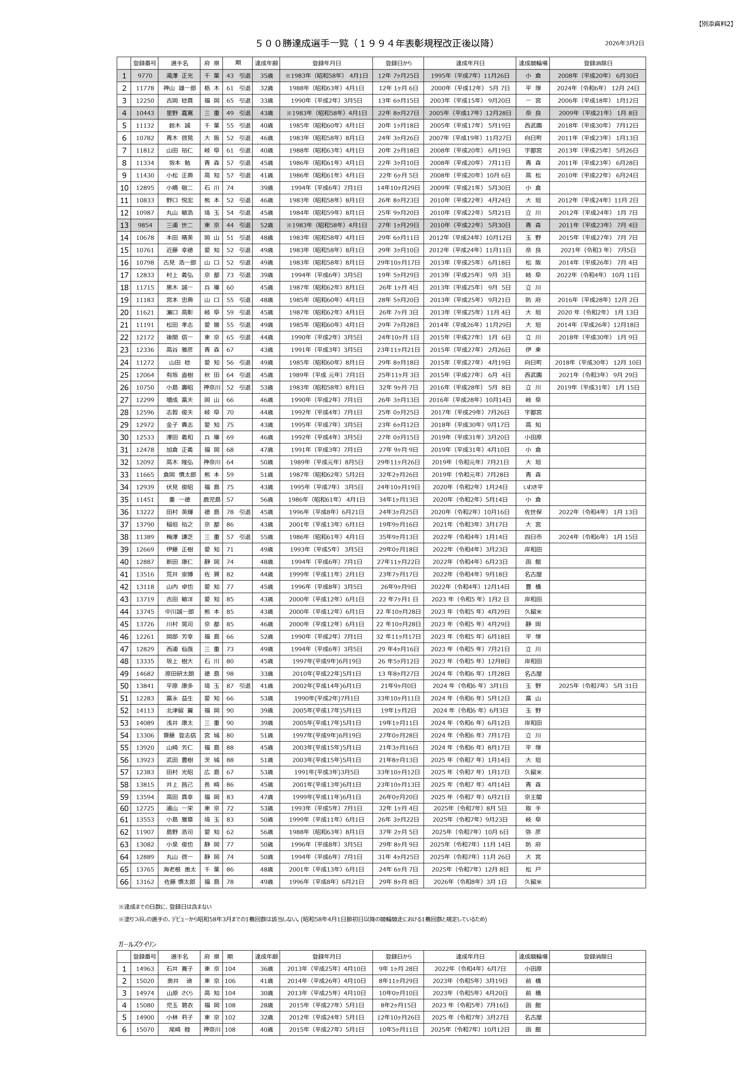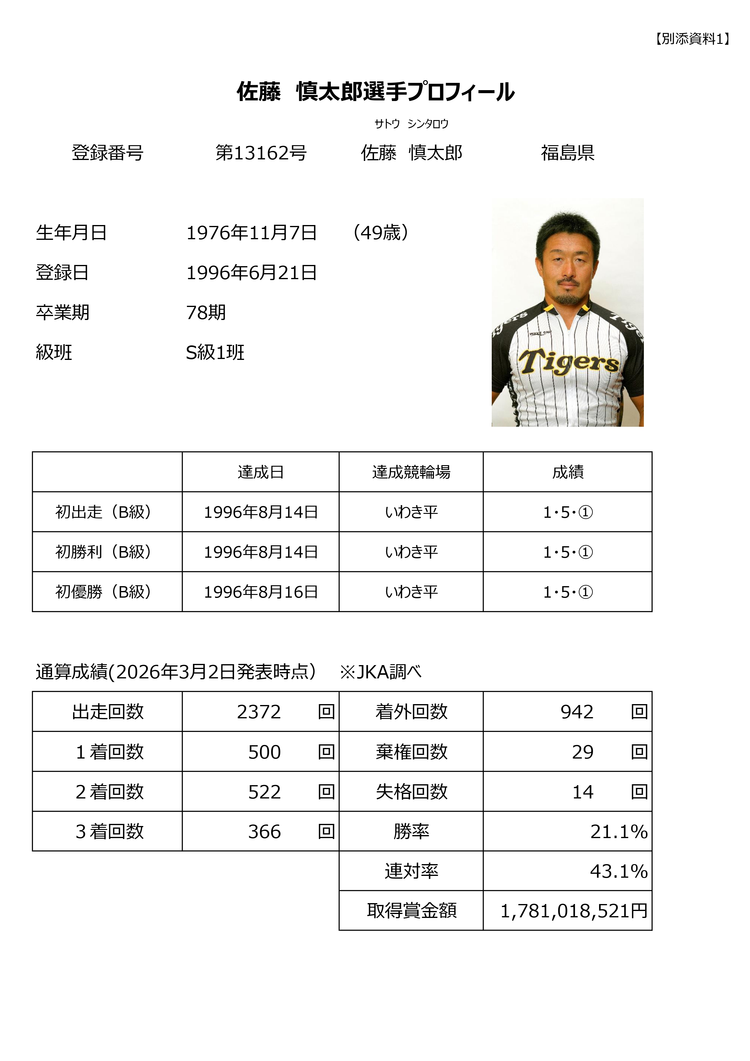 佐藤 慎太郎選手(福島・78期)は昨日(3/1)久留米競輪場(FI・ナイター)第12レース『S級初日特別選抜予選競走』において1着となり、デビューからの通算勝利数500勝を達成しました。佐藤選手の通算500勝達成は、海老根 恵太選手(千葉・86期)が2025年12月8日に松戸競輪場で達成以来、通算72人目(男子選手では66人目)の記録です。