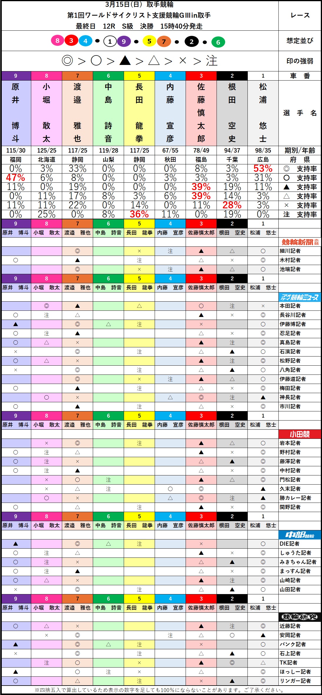 〇支持率1位・上位印が集まっている⑨原井博斗から