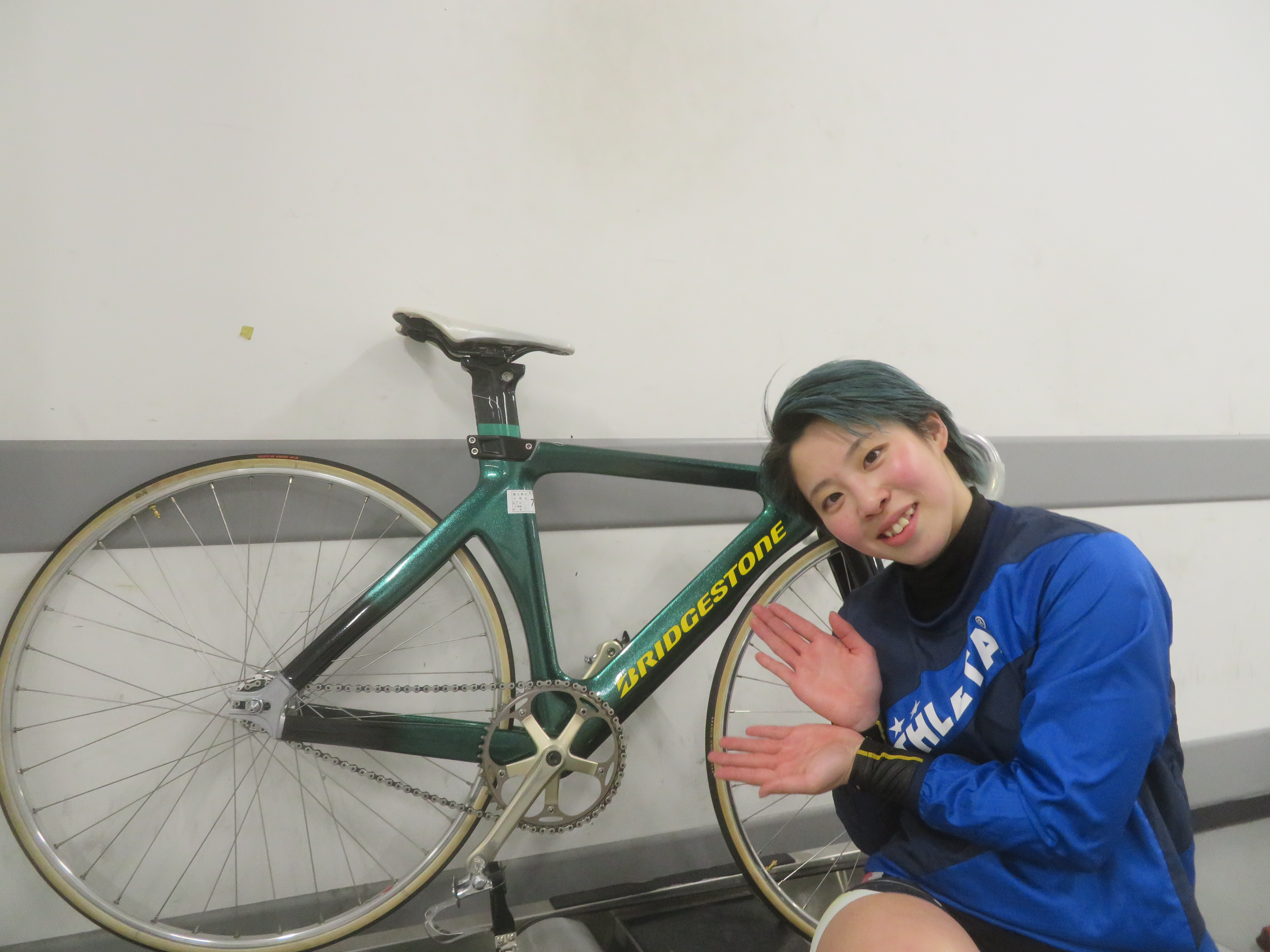 好きな緑の愛車と一緒に優出を決めたレース後の三森彩桜。「キツかったし脚がいっぱいでした。できれば優勝目指して」。