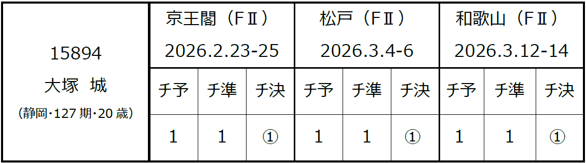 大塚 城 (おおつか じょう)選手〔静岡・127期〕が2026年3月12日から開催されておりました、和歌山競輪(FⅡ・モーニング)の開催において3日間連続1着となり、3場所連続完全優勝を達成し、本日2026年3月15日付で『A級2班』へ特別昇班いたしますので、お知らせいたします。