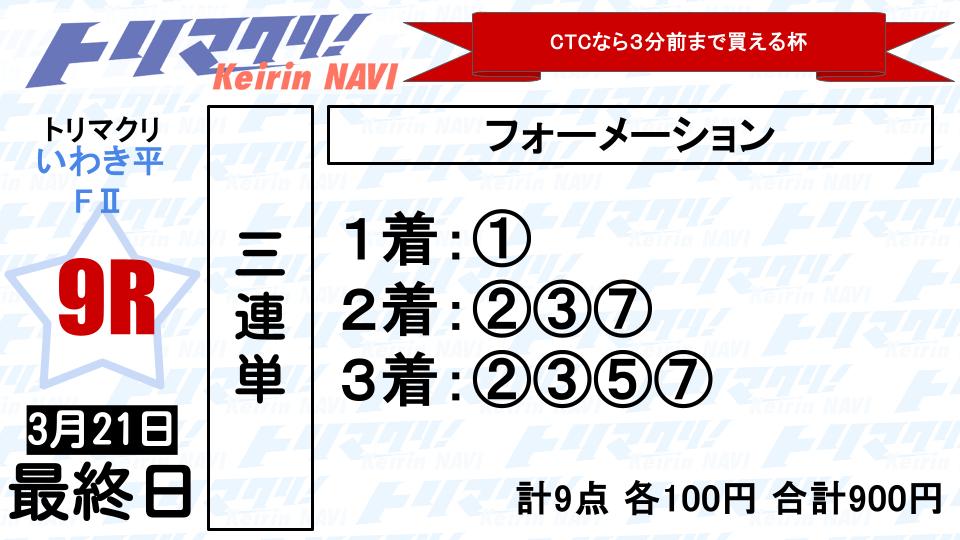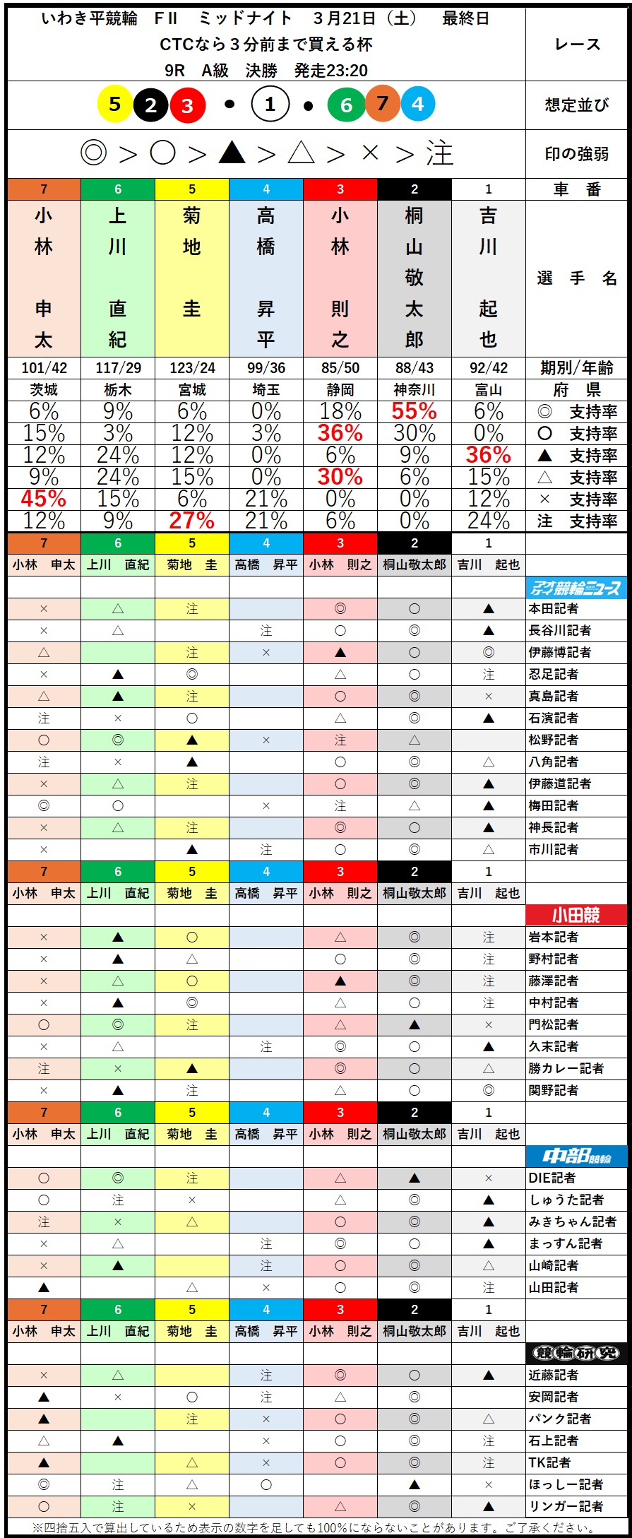 関東ラインは人気を落としているが、⑥上川直紀は前開催優勝していて、侮れません。その番手の⑦小林申太△支持率45%でトップ。⑥上川が積極的に動いてくれれば、勝利も遠くない。