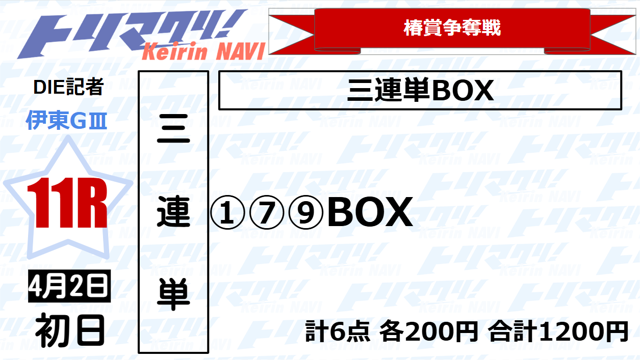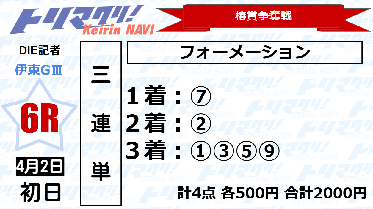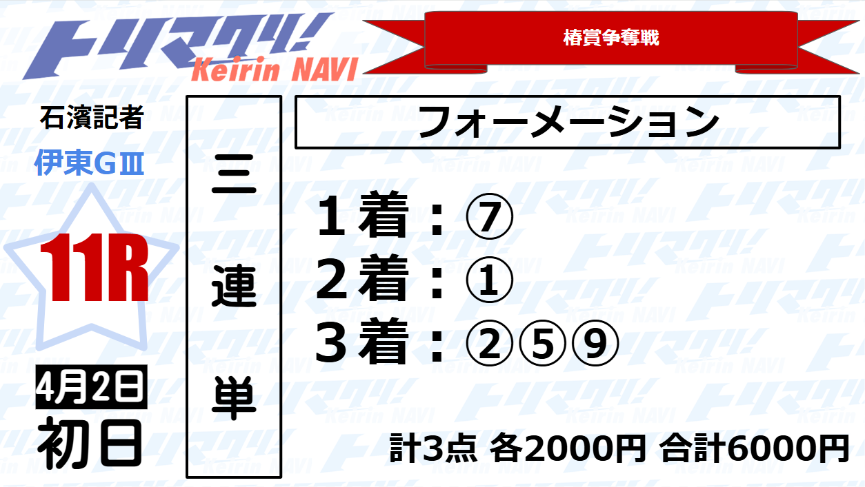 着実にパワーアップを遂げている①山崎歩夢が前受け突っ張りが濃厚な組み合わせ。⑦大槻寛徳とのワンツーが本線。⑨小川真太郎の伸びはケア。