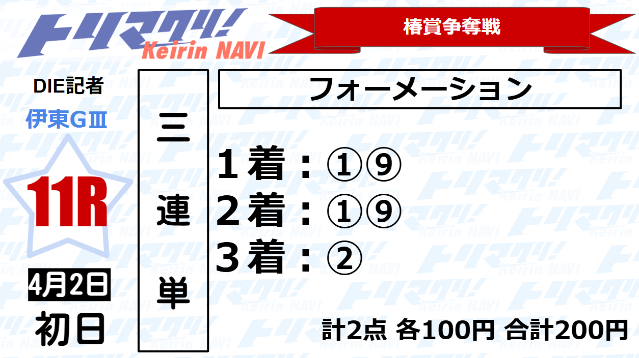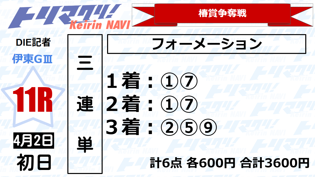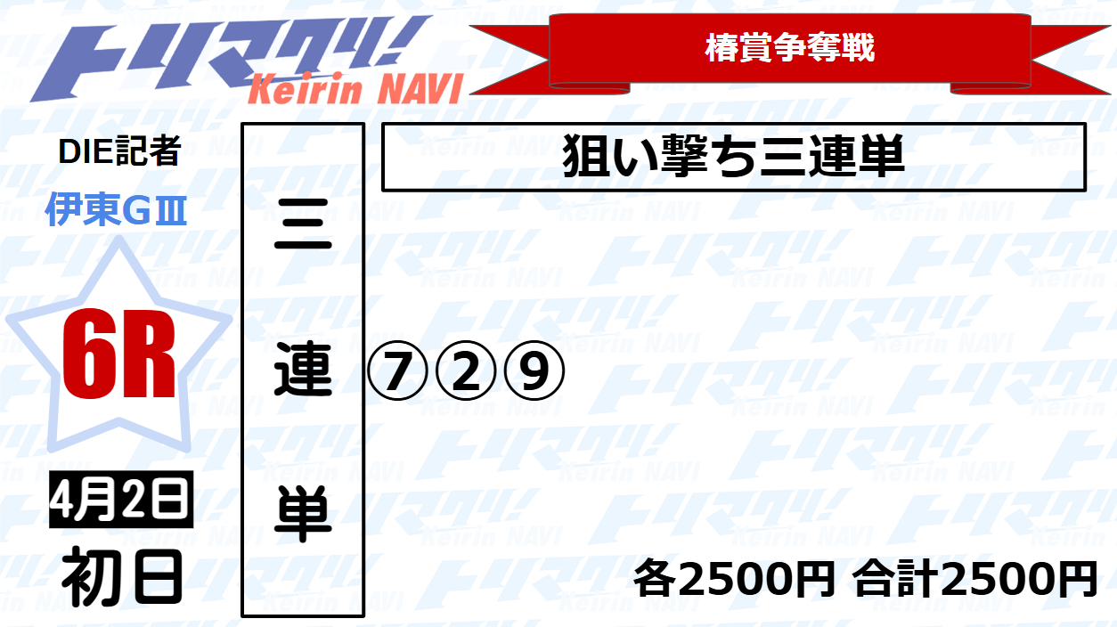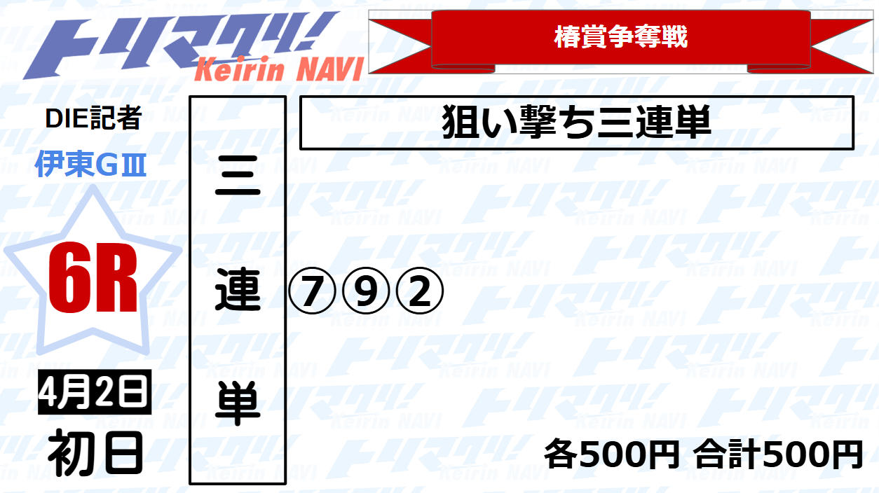 着実にパワーアップを遂げている①山崎歩夢が前受け突っ張りが濃厚な組み合わせ。⑦大槻寛徳とのワンツーが本線。⑨小川真太郎の伸びはケア。