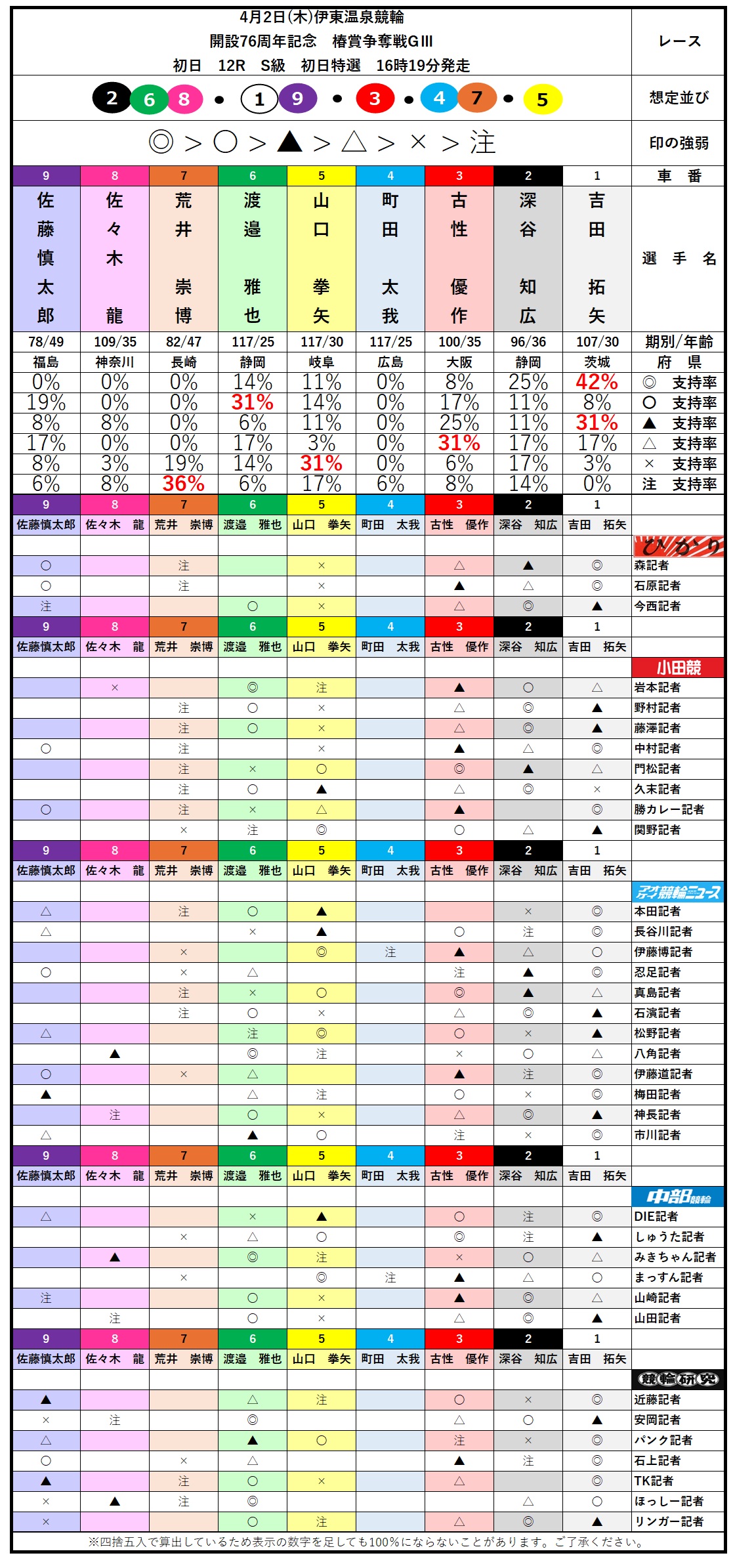〇支持率トップは⑥渡邉雅也の31%。④町田太我との先行バトルになったとしても②深谷知広が主導権を取り切る。その展開なら番手⑥渡邉雅也の前残りの評価でしょうか。次に19%で2番目の評価が①吉田拓矢にマークの⑨佐藤慎太郎。